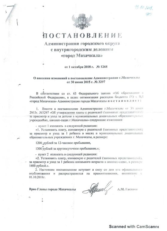 Документ об установлении размера платы, взимаемой с родителей (законных представителей)